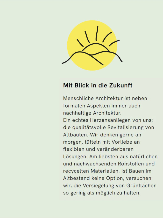 Wir forcieren:Revitalisierung von AltbautenVerwendung nachwachsender RohstoffeMinimierung von HaustechnikGrün im Innen- und Außenraum...