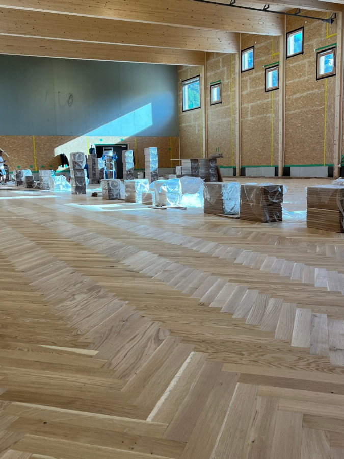 In Kürze ist die neue Doppelsporthalle in Holzbauweise in Zell/WY bereit für die ersten körperlichen Betätigungen. Die Erschließungsflächen, Umkleiden und Sanitärbereiche sind schlicht gehalten. Die Sporthalle selbst wartet mit unterschiedlichen