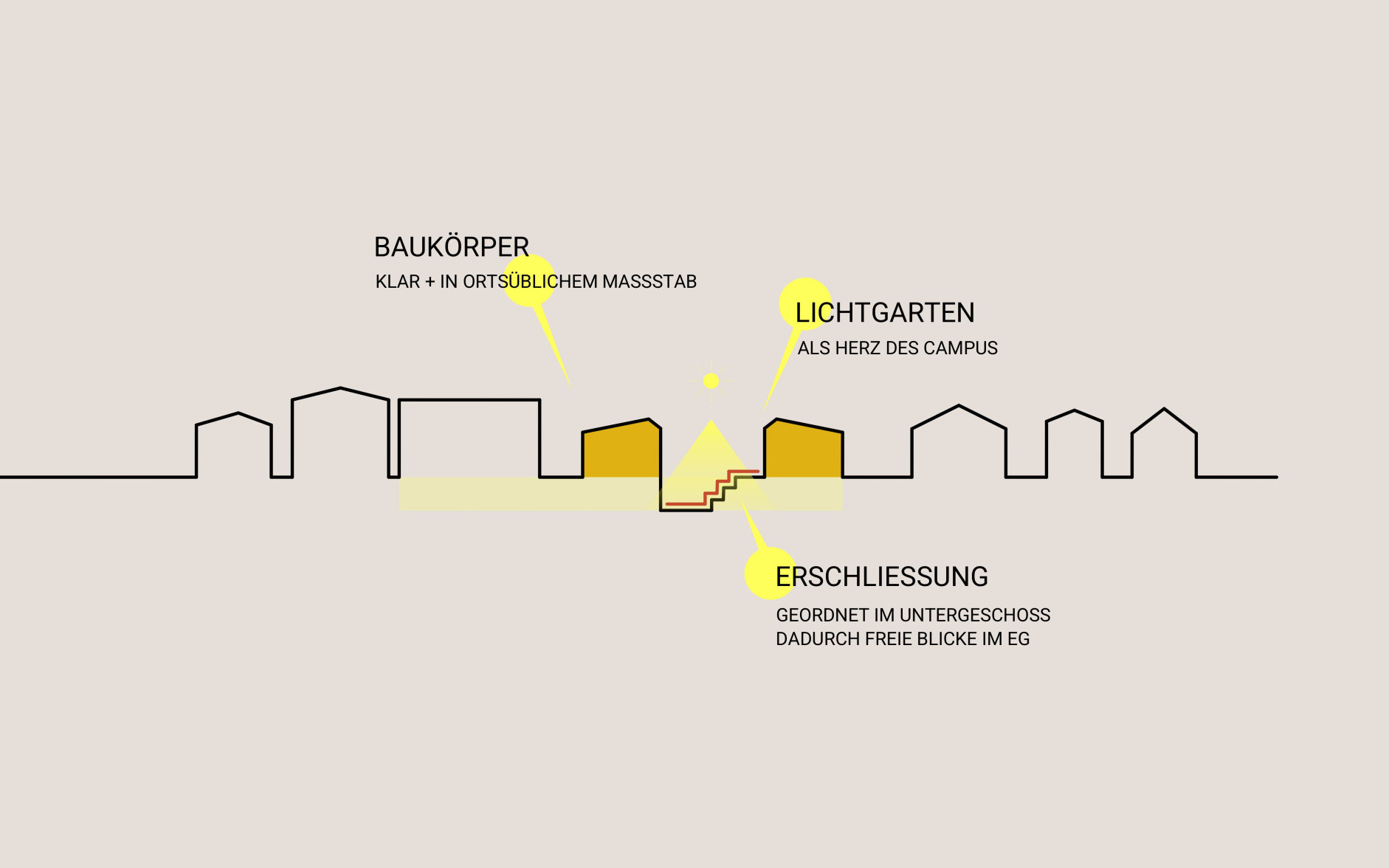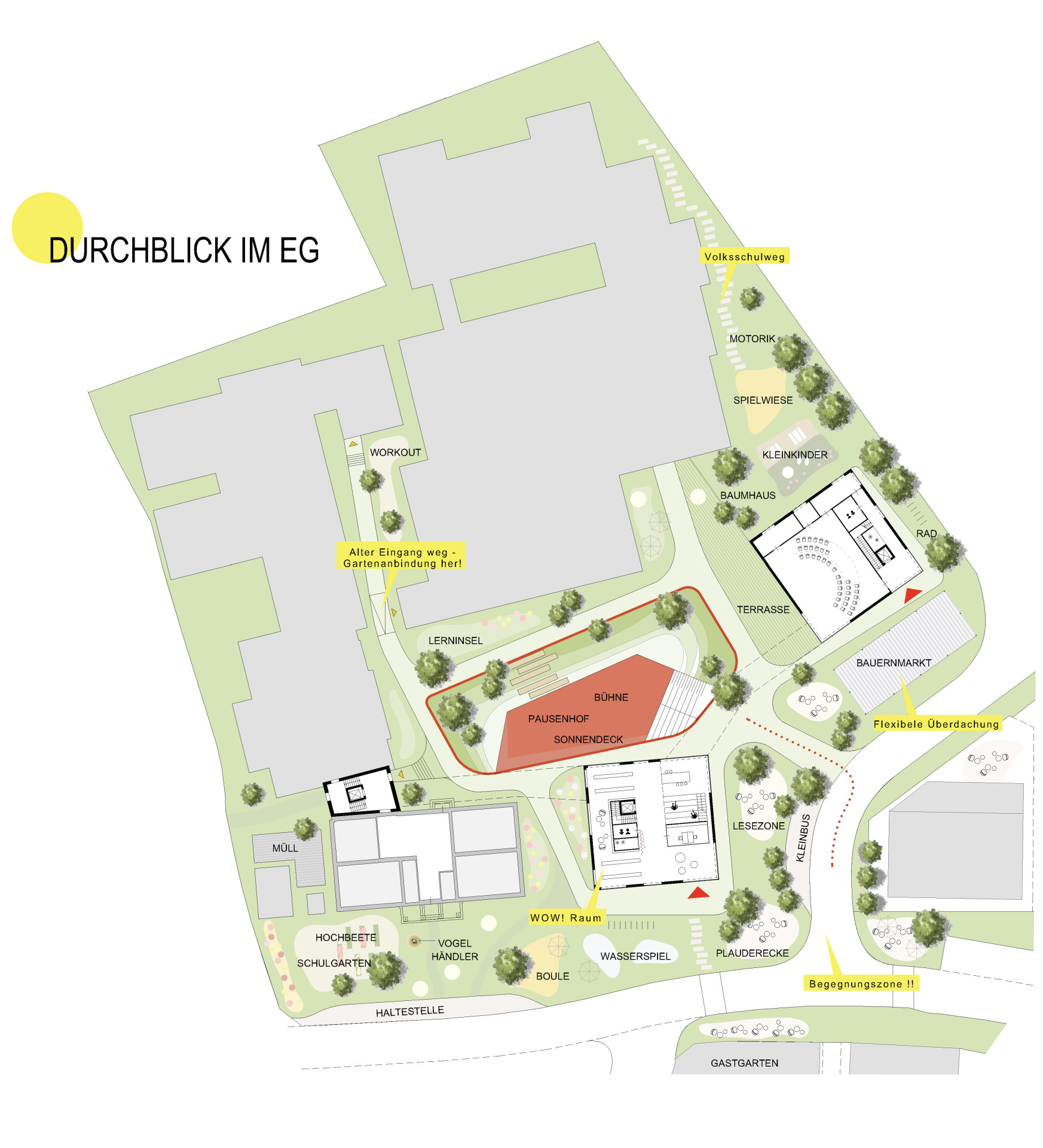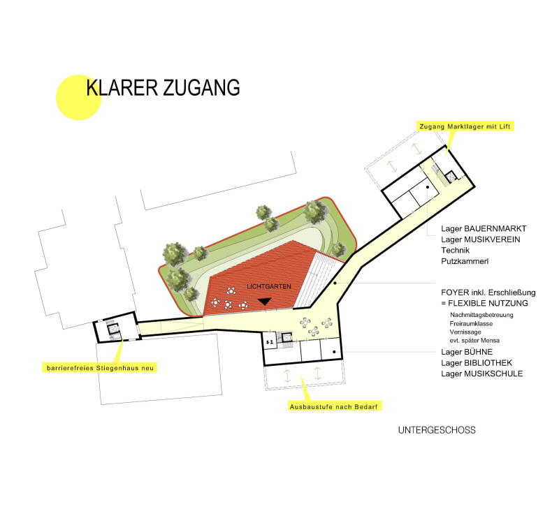 Zwischen den beiden Neubauten entsteht ein offener, einladender Zugang, der über eine großzügige Treppe, die auch als Tribüne nutzbar ist, auf einen tiefergelegten Platz (Niveau UG) – den sogenannten Lichtgarten - führt. Dort befindet sich der neue Haupteingang für die Schüler, der direkt zu den Garderoben führt und gleichzeitig die Gebäude miteinander verbindet. Durch die Terrassierung entsteht ein lichtdurchfluteter Bereich mit vorgelagerter Terrasse, der flexible Nutzungsmöglichkeiten bietet, z. B. für Nachmittagsbetreuung, Freiraumklasse, als Galeriefläche, Workshopzone oder später eventuell als attraktiver Mensaraum mit vorgelagertem Gastgarten. Die Verlagerung der Erschließung ins Untergeschoss hält das Erdgeschoss frei, schafft offene, großzügige Raumsequenzen und ungestörte Sichtachsen. Der Lichtgarten bildet das Herz des Ensembles – ist Treffpunkt, Bühne und Aufenthaltsbereich zugleich – und verknüpft die Gebäude zu einem lebendigen Bildungs- und Kulturraum.