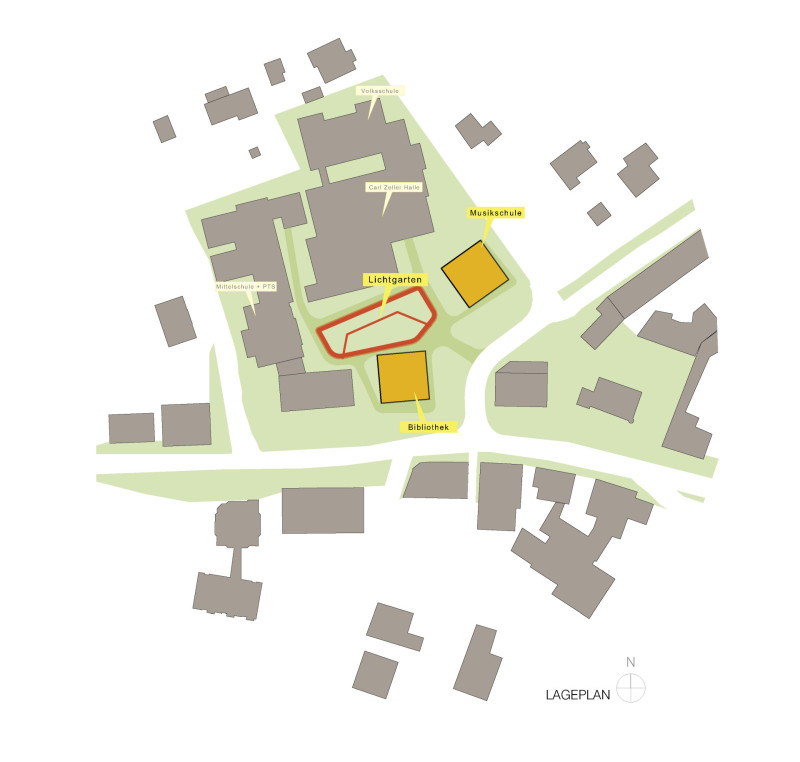 Die historisch gewachsene Marktgemeinde St. Peter in der Au ist geprägt von kleinteiligen Strukturen, traditioneller Bebauung und einem von Grünräumen bestimmten Ortsbild. Am Ende des Marktplatzes tritt die bestehende Schulanlage als prägnanter Baukörper in Erscheinung. Anstatt diesen durch einen weiteren Anbau zu betonen, greift der Entwurf bewusst die ortstypische Kleinteiligkeit auf. Zwei kompakte, maßstäblich abgestimmte Baukörper bilden das Rückgrat des neuen Bildungs- und Kulturcampus. Ihre Positionierung an den Bauplatzrändern schafft gemeinsam mit Neuer Mittelschule, Polytechnischer Schule, Turnsaal und Carl-Zeller-Halle einen klar gefassten Bereich. Im Zentrum entsteht ein neuer Platz – ein Lichtgarten - als gemeinsamer Aufenthalts- und Begegnungsraum. Dieser ist von allen Seiten zugänglich und verbindendes Element zwischen bestehenden und neuen Bildungsbauten. So entsteht ein Ensemble mit Campuscharakter, das einen öffentlichen Raum mit hoher Aufenthaltsqualität und identitätsstiftender Wirkung für den gesamten Ort bildet und zugleich die Verbindung zwischen historischem Marktplatz und Graf-Segur-Platz herstellt.