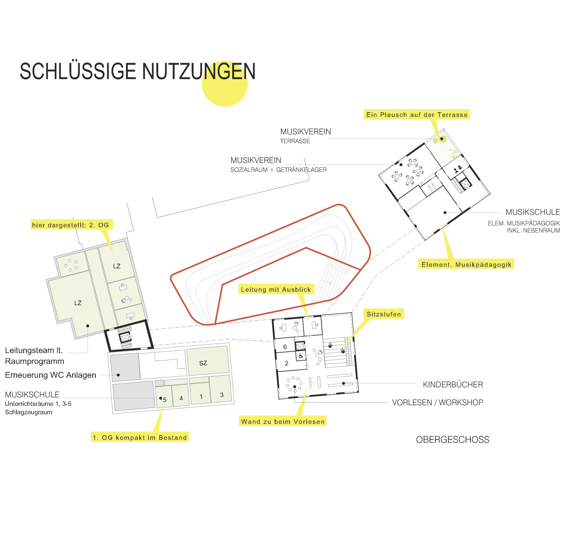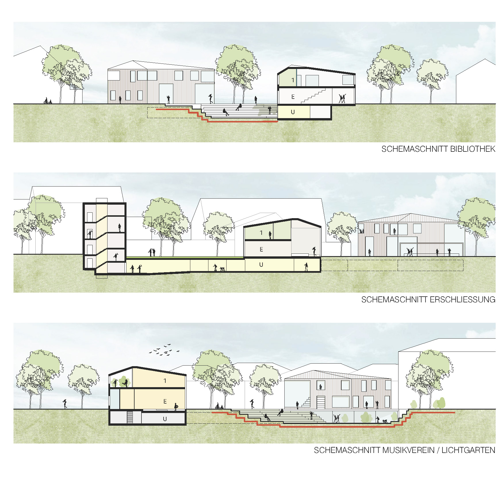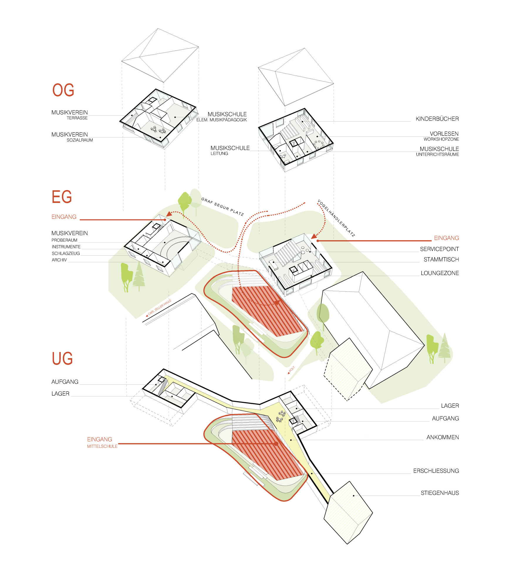 Die Erdgeschossbereiche der Bibliothek sind flexibel nutzbar – für klassischen Betrieb, Lesungen, Workshops oder Filmabende – und öffnen sich großzügig zum Garten. Im Obergeschoss liegen Kinder- und Lesebereiche sowie Räume der Musikschule, die sowohl Rückzugs- als auch Arbeitsbereiche für kleine Gruppen bieten. Die offene Tribünentreppe verbindet die Ebenen und schafft Aufenthaltsqualität und Vernetzung zwischen den Bereichen. Im zweiten Gebäude sind der Musikverein und Musikschule untergebracht. Das Erdgeschoss umfasst einen großen Proberaum sowie notwendige Nebenräume. Im Obergeschoss befindet sich ein Aufenthaltsraum mit überdachtem Freibereich. Die Versorgung erfolgt über den Nebeneingang zum Vogelhändlerplatz, der zugleich Zugang zu Lagerflächen im Untergeschoss und zum halböffentlichen WC ist. Der Außenraum ist integraler Bestandteil des Campus. Fließende Übergänge zwischen Innen- und Außenbereichen, ein zentraler, flexibel nutzbarer Platz für Schulfeste, Konzerte, Märkte oder tägliche Begegnungen sowie multifunktionale Freiflächen mit Sitzstufen, Spielinseln und begrünten Terrassen schaffen Rückzugsorte, Bewegungsräume und beleben den Campus.